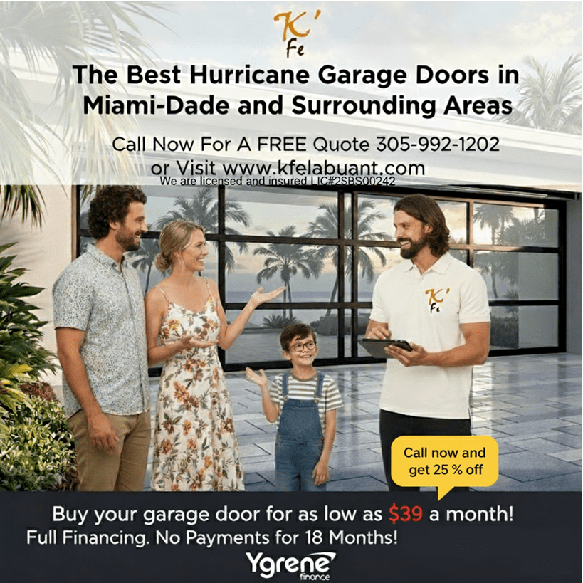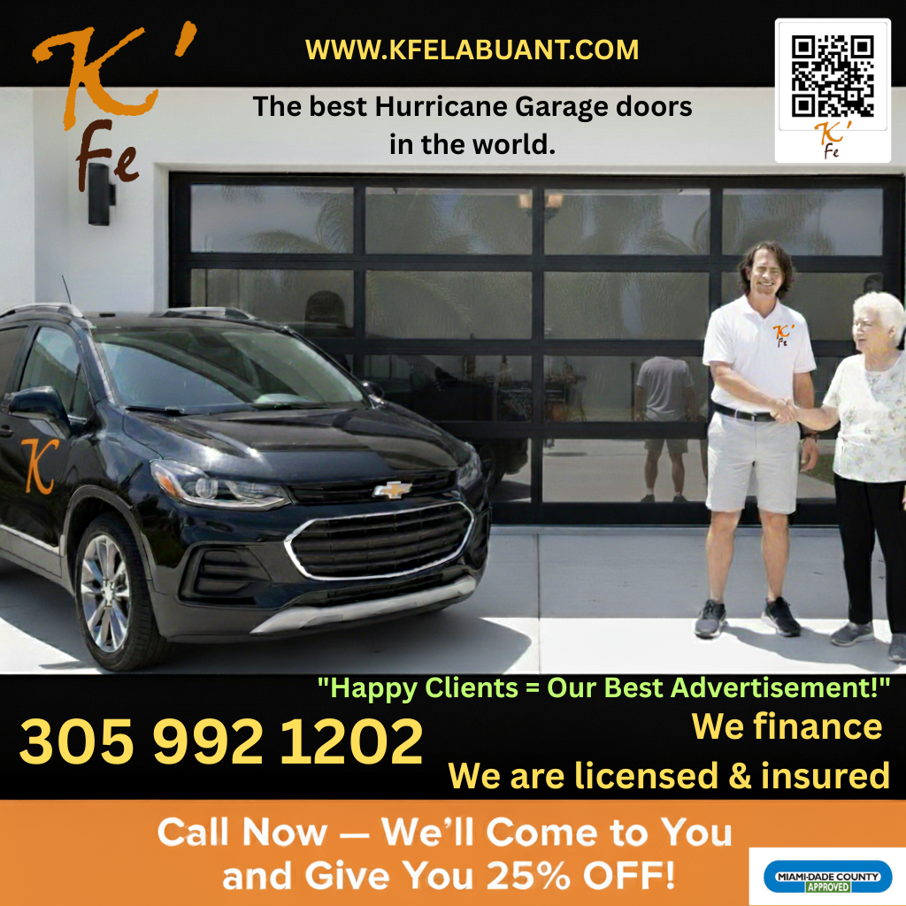 K’FE LABUANT LLC offers the most affordable, durable, and code-approved hurricane-rated garage doors in Miami-Dade County and surrounding areas. With over 20 years of experience, we install garage doors built to withstand Florida’s most dangerous storms — all backed by 100% financing, low monthly payments, and fast, professional service.